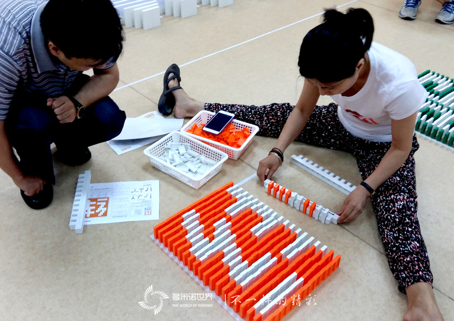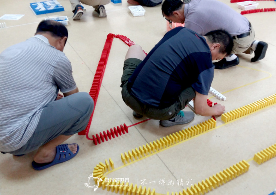 為了讓大家更快的進(jìn)入角色,多米諾世界團(tuán)隊(duì)的王磊老師介紹完多米諾運(yùn)動(dòng)后,特別設(shè)置了一個(gè)多米諾游戲挑戰(zhàn)賽。三個(gè)精巧、有趣的多米諾游戲,激起了大家的興趣,令所有隊(duì)員很快便沉浸在多米諾的世界中。在一枚枚骨牌的堆砌過程中,一張張專注的臉龐,失敗時(shí)的沮喪目光,成功時(shí)的神采飛揚(yáng),仿佛回到了難忘的童年時(shí)光。