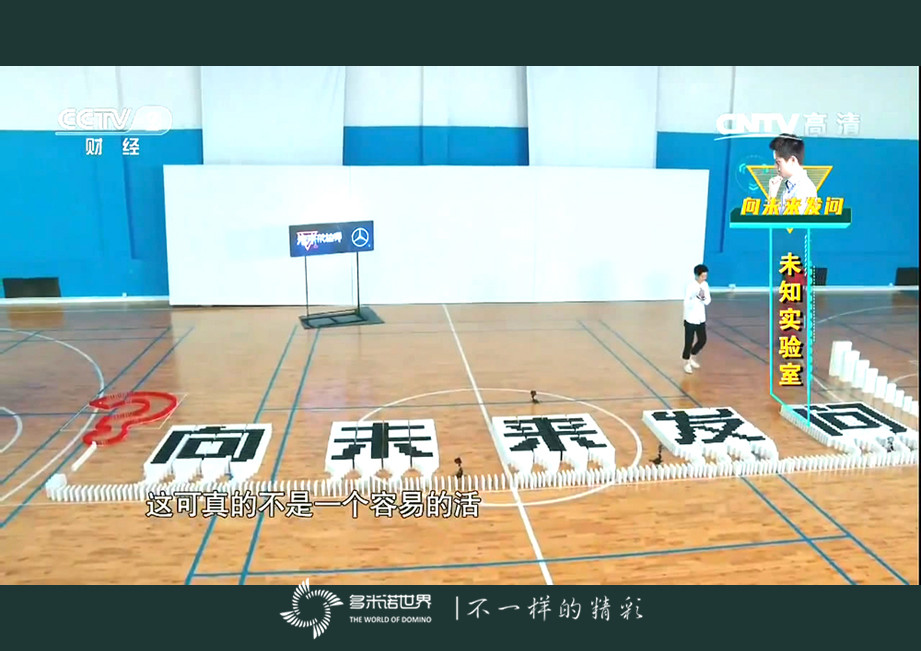 節(jié)目每期以一個(gè)主題詞作為核心線索,嘉賓圍繞主題詞分享關(guān)于未來探索與展望的話題與觀點(diǎn)。在未知實(shí)驗(yàn)室版塊,90后發(fā)明家、天才少年薛來,作為科學(xué)實(shí)驗(yàn)員,用不同大小的多米諾骨牌完成了一個(gè)實(shí)驗(yàn)。實(shí)驗(yàn)由5厘米高的小骨牌開始啟動(dòng),呈現(xiàn)“向未來發(fā)問”文字后,最終觸及50厘米高的大骨牌。通過實(shí)驗(yàn),薛來告訴大家,每個(gè)人所做的每一件事都會(huì)像骨牌一樣一環(huán)一環(huán)的傳遞下去,會(huì)形成巨大的能量,要?jiǎng)?chuàng)造人類美好的未來世界,需要每一個(gè)人的努力。