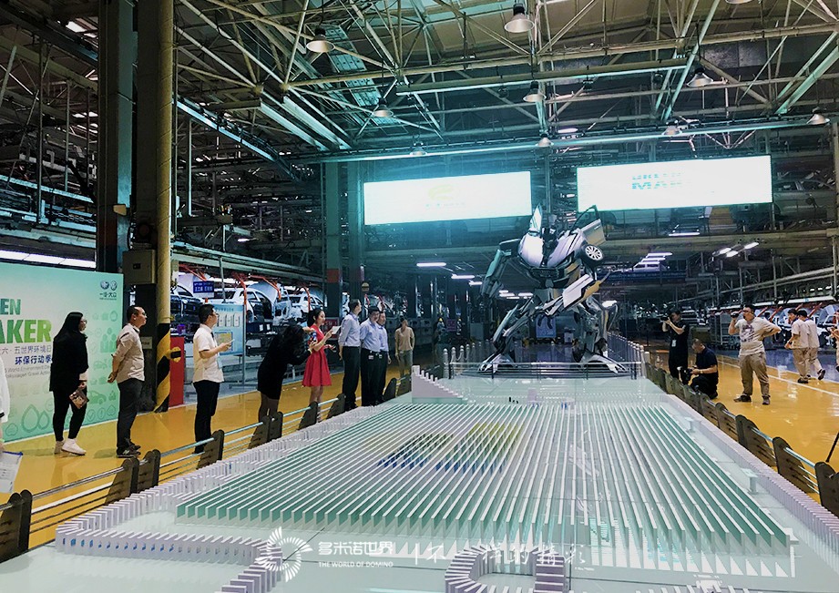 本次世界環(huán)境日一汽-大眾的核心活動(dòng)是推出《一汽-大眾環(huán)保體系視覺識(shí)別系統(tǒng)》,活動(dòng)主辦方特別邀請北京的多米諾世界團(tuán)隊(duì)親臨長春,在轎車二廠寶來總裝車間,用7500枚印有環(huán)保體系視覺識(shí)別系統(tǒng)環(huán)保標(biāo)識(shí)的骨牌碼放巨幅多米諾陣列。當(dāng)與會(huì)領(lǐng)導(dǎo)共同啟動(dòng)多米諾骨牌,呈現(xiàn)出《一汽-大眾環(huán)保體系視覺識(shí)別系統(tǒng)》主標(biāo)識(shí)“創(chuàng)?享 綠色未來”,主題畫面的完美呈現(xiàn)標(biāo)志著《一汽-大眾環(huán)保體系視覺識(shí)別系統(tǒng)》的正式發(fā)布,也體現(xiàn)了一汽-大眾依然堅(jiān)持走可持續(xù)發(fā)展之路,在持續(xù)向消費(fèi)者提供質(zhì)量可靠的產(chǎn)品的同時(shí),堅(jiān)持環(huán)保和綠色理念,創(chuàng)建節(jié)能環(huán)保工廠的堅(jiān)定決心。